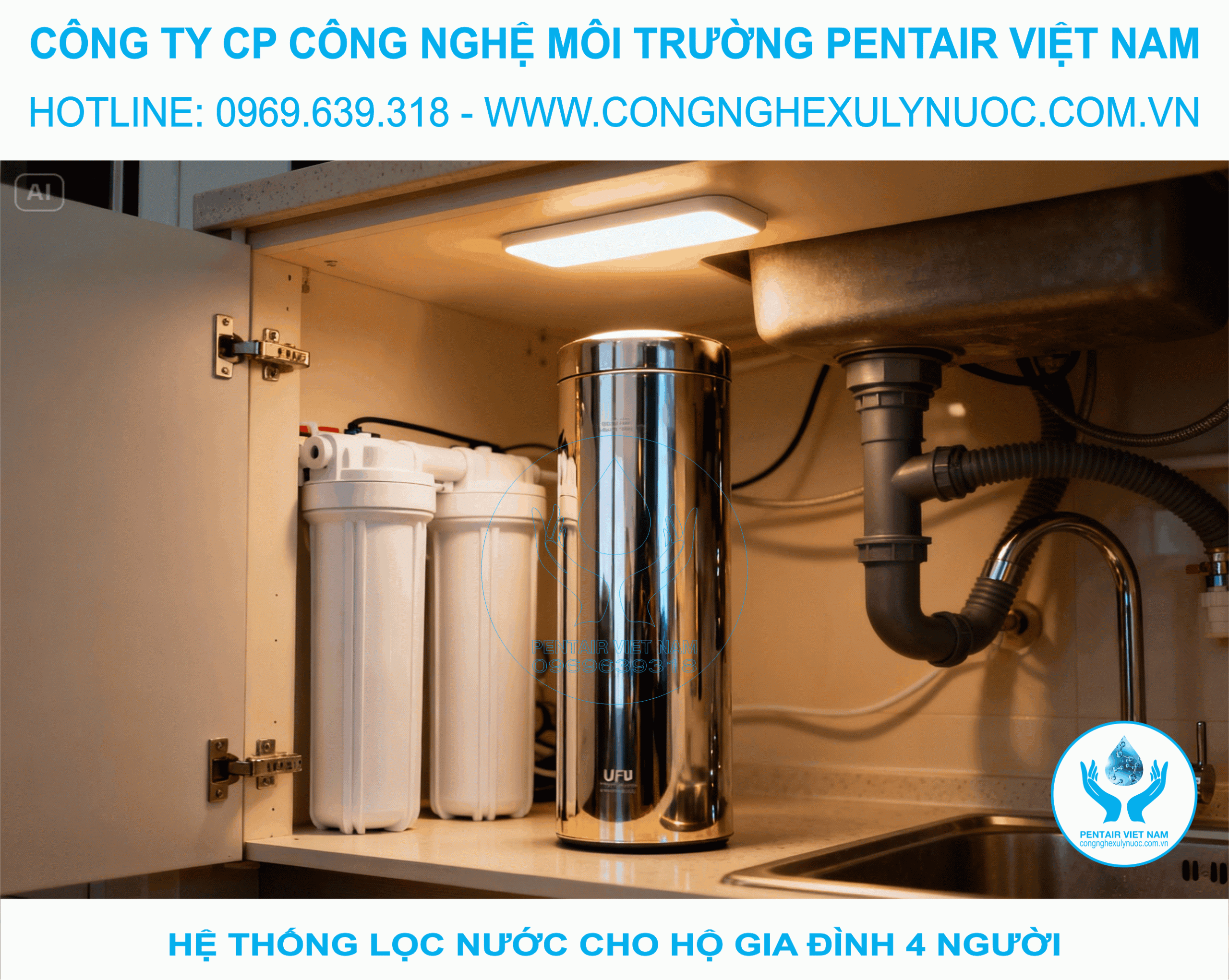 Hệ thống lọc nước cho hộ gia đình 4 người lắp trong tủ bếp